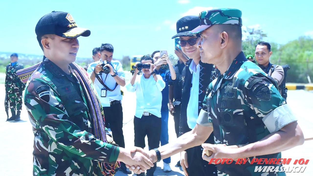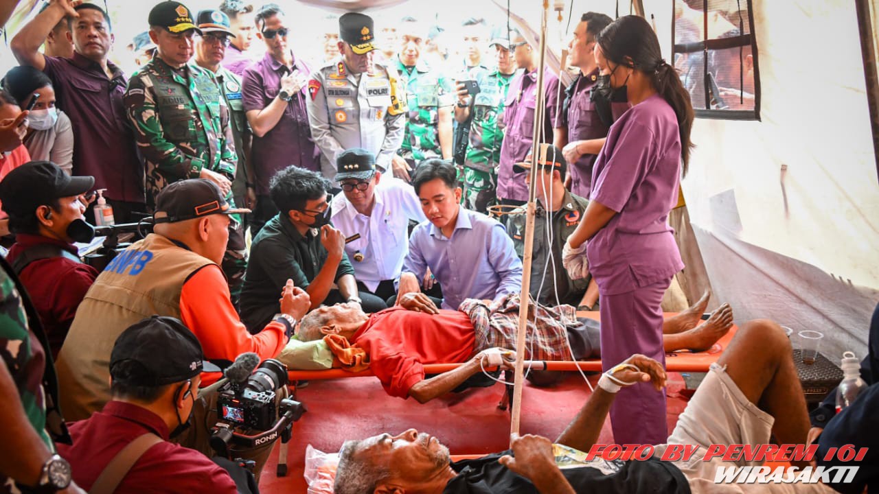 Danrem 161/Wira Sakti Brigjen TNI Joao Xavier Barreto Nunes, S.E., M.M. mendampingi Wakil Presiden RI (Wapres) Gibran Rakabuming saat melaksanakan peninjauan warga masyarakat korban erupsi Gunung lewotobi laki-laki Kab. Flores Timur, Kamis (14/11/2024).